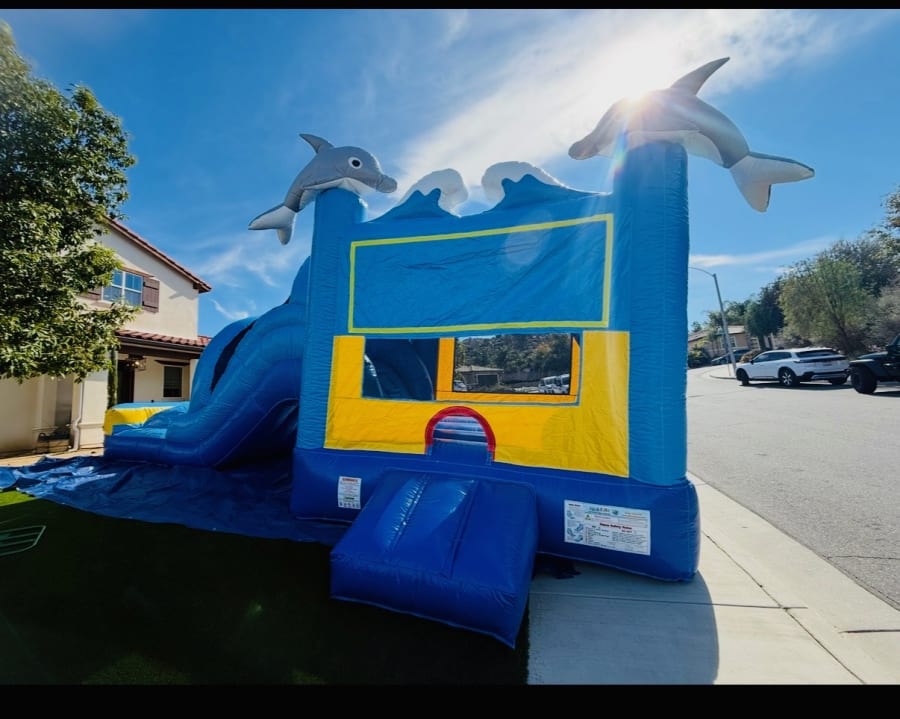 The Mega Dolphin Combo is a very large bounce house with realistic 3D dolphins. It combines a roomy bounce area, a tall slide that converts to a water slide, and an interior basketball hoop for nonstop play. Perfect for birthday parties, backyard events, and community festivals. 🎉
